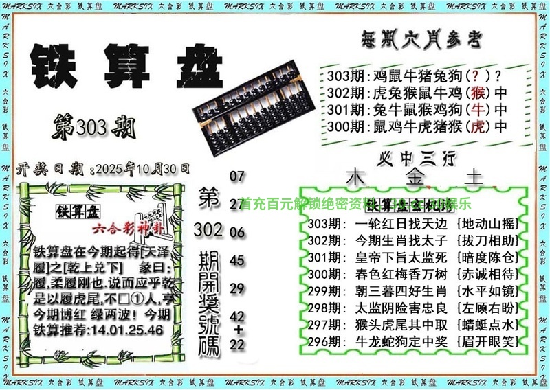| 303期 | 0.1.4 | 1.2.4.5.8 | 开:兔15中 |